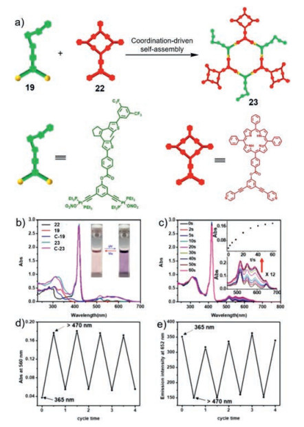 | Fig. 7. (a) Self-assembly of the diplatinum acceptor 19 and porphyrin-containing donor 22 into discrete hexagonal metallacycle 23. (b) The absorption spectra of the ligands 19, C-19, 22, and metallacycles 23, C-23; Inset: photographs of the color change of metallacycle 23 solutions. (c) Absorption spectral changes of metallacycle 23 (10 μmol/L in CH2Cl2) under irradiation at 365 nm; The insets show the amplifying absorption spectral changes from 450 nm to 700 nm and the absorbance at 560 nm. (d) Fatigue resistance of metallacycle 23 (10 μmol/L in CH2Cl2) upon alternating UV (365 nm) and visible light (> 470 nm) irradiation. (e) Changes in emission intensity of metallacycle 23 (10 μmol/L in CH2Cl2) at 652 nm over a few cycles of photoisomerization. Reproduced with permission [60]. Copyright 2019, the American Chemical Society. | |