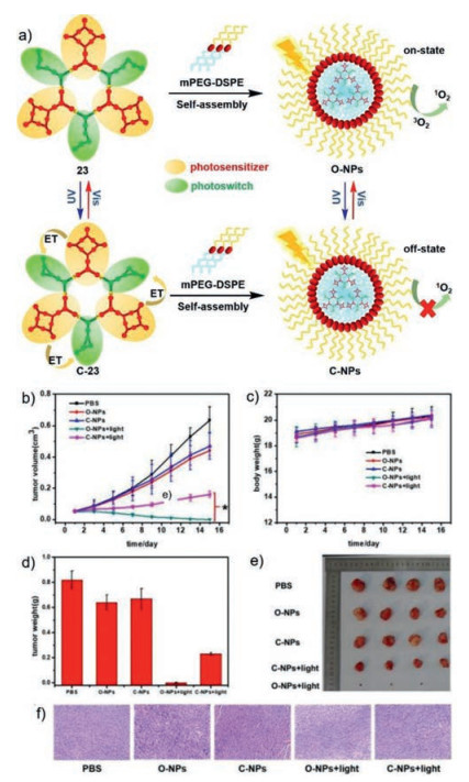 | Fig. 8. (a) Schematic representation of the controllable generation of 1O2 in metallacycle 23 and NPs. mPEG-DSPE agents are used for nanoparticles formation. Nanoparticles in ring-open form state (O-NPs) are in the on state of photosensitization and generate 1O2. Nanoparticles in ring-closed form state (C-NPs) are in the off state of photosensitization and do not generate 1O2. (b) Tumor growth inhibition curves after PDT treatment. (c) Mice body weight curves with relevant treatments. (d) Tumor weight curves with relevant treatments. (e) Photo of tumors of each group after PDT. One tumor in the O-NPs + light group was completely eradicated at the end point. (f) Histology of tumor slices of mice in various groups after PDT treatment. Copied with permission [60]. Copyright 2019, the American Chemical Society. | |