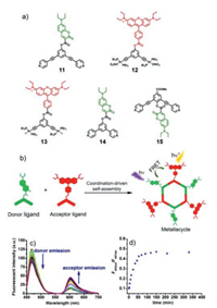 | Fig. 3. (a) Structures of building blocks 11–15. (b) Cartoon presentation of coordination-driven self-assembly of the donor ligand and the acceptor ligand. (c) Time-dependent changes in the emission spectra of the mixture of ligand 11 (30 μmol/L) and unit 12 (30 μmol/L) in acetone. (d) Change in the ratio of the fluorescence intensity with time of the acceptor intensity maximum (602 nm) and donor emission maximum (467 nm) upon combination of ligand 11 (30 μmol/L) and unit 12 (30 μmol/L) in acetone. Reproduced with permission [59]. Copyright 2017, the American Chemical Society. | |