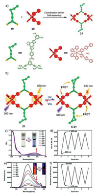 Photoswitchable fluorescence-resonance energy transfer within the metallacycles has attracted considerable attention because of their potential applications in fluorescence imaging, information storage, photoswitchable molecular devices, and reversible erase/rewrite optical materials. Recently, Yang and Xu et al. prepared a rhombic metallacycle 21 by stirring a mixture of the diarylethene-containing diplatinum(II) acceptor 19 and an Ir complex-containing donor 20 in a 1:1 ratio in a solution of acetone and water (Fig. 5) [86]. Notably, the large overlap between the emission spectrum of 20 and the absorption spectrum of ringclosed form of acceptor 19 (C-19) enabled the occurrence of FRET while the lack of spectral overlap between the emission spectrum of 20 and the absorption spectrum of ring-open form of acceptor 19 prevented the energy transfer from Ir complex to diarylethene unit. As depicted in Figs. 5c-e, upon irradiation the metallacycle 21 at 365 nm in a nitrogen atmosphere, a new absorption peak at 560 nm appeared and the emission peak at 630 nm decreased rapidly, which provided the direct evidence for the existence of FRET from the Ir complex to the ring-closed form diarylethene. However, after irradiation the above solution with visible light (λ > 430 nm), the absorption spectrum and the emission spectrum of metallacycle 21 could almost be fully recovered to its original state due to the reverse photoisomerization of diarylethene moieties. These results indicated that FRET can efficiently occur when the diarylethene unit was in its ring-closed form and light-controlled FRET switching was successfully achieved.