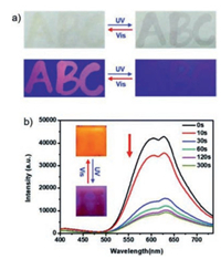 | Fig. 6. (a) Color and fluorescence images of characters written using metallacycle 21 before and after irradiationwith UV or visible light. (b) Emission spectral changes of a PVDF film loaded with metallacycle 21 (2 wt%) upon irradiation at 365 nm. Copied with permission [86]. Copyright 2019, the Royal Society of Chemistry. | |