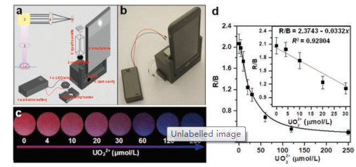 | Fig. 4. (a) The structure and the light path diagram of the cellphone-based optical platform device. (b) The picture of the assembled cellphone-based optical sensing platform device. (c) The luminescent images of the sensing system upon additions of different amounts of UO22+ ions, which were directly taken by the cellphone digital camera. (d) The simulated correlation between the ratio of R/B values versus UO22+ ions concentration. The inset is the linear relationship of R/B versus UO22+ ions in the range from 0 μmol/L to 30.0 μmol/L. | |