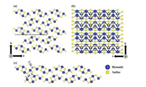 | Fig. 2. The crystal structure of Bi2S3: (a) a-b and (b) b-c planes, and (c) representation of the crystal showing noncovalent bonding lengths and van der Waals bonds (shown by red dotted lines), along with their lengths. Copied with permission [33]. Copyright 2018, American Chemical Society. | |