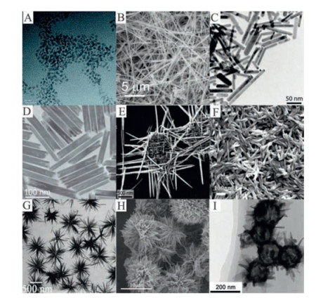 | Fig. 3. Images of Bi2S3 nanomaterials with different morphologies. (A) Bi2S3 nanodots. Reproduced with permission [40]. This figure has been adapted for free from ref [40]. licensed under Creative Commons Attribution-NonCommercial 3.0 Unported (CC BY-NC 3.0) Licence (https://creativecommons.org/licenses/by-nc/3.0/). (B) Bi2S3 nanowires. Reproduced with permission [43]. Copyright 2013, American Chemical Society. (C) Bi2S3 nanorods. Reproduced with permission [42]. Copyright 2005, American Chemical Society. (D) Bi2S3 nanotubes. Reproduced with permission [41]. This figure has been adapted for free from ref [41]. licensed under the Creative Commons Attribution 4.0 International License of Spring Nature (https://creativecommons.org/licenses/by/4.0/). (E) Disc-like Bi2S3 nanorod networks. Reproduced with permission [42]. Copyright 2005, American Chemical Society. (F) Bi2S3 nanobundles. Reproduced with permission [45]. Copyright 2016, Elsevier. (G) Bi2S3 nanoflowers. Reproduced with permission [48]. Copyright 2011, Elsevier. (H) Bi2S3 nanoflowers. Reproduced with permission [47]. Copyright 2009, American Chemical Society. (I) Nanoscale urchins. Reproduced with permission [46]. Copyright 2016, the Royal Society of Chemistry. | |