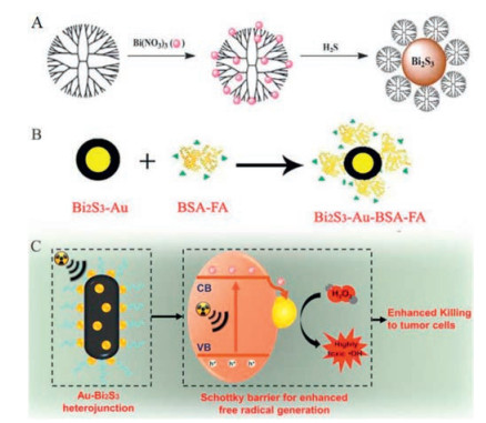 | Fig. 5. The surface modification of Bi2S3 nanomaterials. (A) Illustration showing the preparation of Bi2S3 dendritic polymer stable NCs. Reproduced with permission [21]. Copyright 2013, the Royal Society of Chemistry. (B) Synthetic procedure of Bi2S3-Au heterodimer (Bi2S3-Au-BSA-FA hybrids) modified with both FA and BSA showing high targeting activity. Reproduced with permission [84]. Copyright 2020, American Chemical Society. (C) Illustration of the therapeutic process based on AuBi2S3 hetero-nanostructure composites (HNSCs). Reproduced with permission [85]. Copyright 2019, American Chemical Society. | |