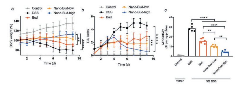 | Fig. 3. (a) The changes of body weight in each group for 9 d. Effects of Bud and Nano-Bud systems on colonic (b) DAI score and (c) MPO activity in mice with DSS-induced colitis. Data are means ± SEM from a representative experiment (n = 5 biologically independent animals) from two independent experiments. *P < 0.05, **P < 0.01, ***P < 0.001, ****P < 0.0001, analyzed by two-way ANOVA with Tukey's HSD multiple comparison post hoc test. | |