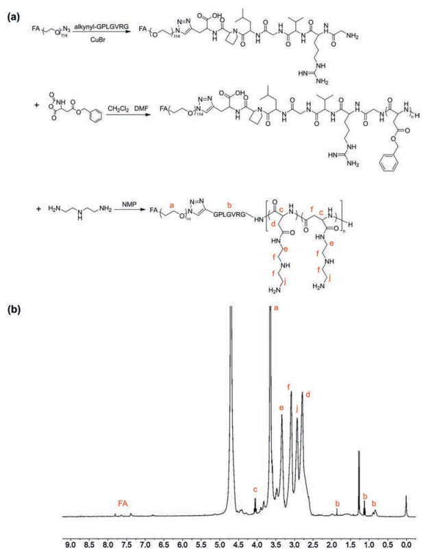 | Fig. 1. Illustration of synthetic route of FA-PEG-GPLGVRG-PAsp(DET) (a) and its 1H NMR spectrum (b). | |