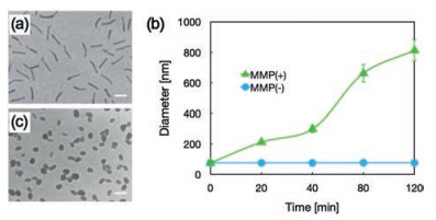 | Fig. 2. Physiochemical characterizations of self-assemblies of PEG-GPLGVRG-PAsp (DET) and pDNA at N/P ratio of 8: Morphologies of PEG-GPLGVRG-PAsp(DET)-based polyplex micelle (a) in absence and (c) in presence of MMP-2 (characterized to be spherical nanoparticles with obvious aggregation). Scale bar: 100 nm; (b) Time-dependent measurement for PEG-GPLGVRG-PAsp(DET)-based polyplex micelle in presence or absence of MMP-2. | |