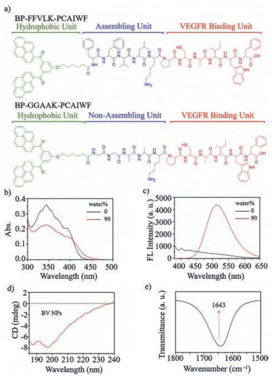 | Fig. 1. Molecular design and self-assembly of binding VEGF (BV) peptides. (a) Molecular structure of BV peptide and C-BV peptide. (b) UV-vis and (c) fluorescence spectra characteristics of self-assembly process to form BV NPs (c = 2.0 × 10-5 mol/L) in mixed H2O/DMSO solutions. (d) CD spectral characterization of BV NPs at 0 h. (e) FT-IR spectrum of BV NPs at 0 h. | |