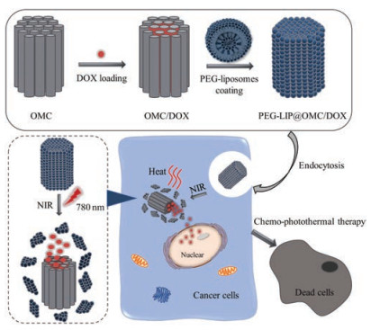 | Fig. 1. Schematic illustration for the formation of multifunctional PEG-LIP@OMC/DOX and its application for chemo-photothermal synergistic therapy of cancer cells. | |