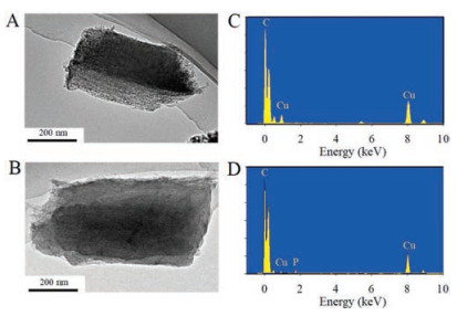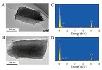 | Fig. 2. TEM images and TEM-associated EDX spectra of different samples: (A and C) naked OMC, (B and D) PEG-LIP@OMC. | |