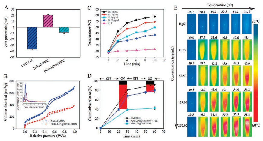 | Fig. 3. (A) Zeta potential of different nanoparticles in aqueous solutions. (B) N2 adsorption-desorption isotherms of as-obtained OMC and PEG-LIP@OMC/DOX.(Inset: corresponding pore diameter distributions). (C) The photothermal heating curves of PEG-LIP@OMC with different concentrations (31.25-250 μg/mL) under 780 nm laser irradiation at a power density of 1.1 W/cm2. (D) Release behavior of PGE-LIP@OMC/DOX. PGE-LIP@OMC/DOX (1 mg/mL) dispersions were irradiated with or without NIR laser (780 nm, 1.1 W/cm2, 10 min) at 30, 60 min, respectively. (E) The infrared imaging of PEG-LIP@OMC during 10 min of laser irradiation (780 nm, 1.1 W/cm2) at different sample concentrations. | |