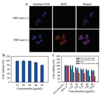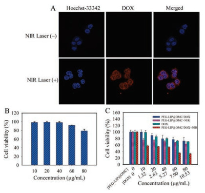 | Fig. 4. (A) The CLSM images of controlled release behavior of PEG-LIP@OMC/DOX (80 μg/mL) with or without 780 nm NIR irradiation (1.1 W/cm2, 10 min) after incubating with MCF-7 cells for 60 min. The cells were stained with cell nucleus dye of Hoechst-33, 342 (shown as the blue color). (B) Viability of MCF-7 cells treated with different concentrations of PEG-LIP@OMC (C) Cytotoxicity assays of MCF-7 cells after various treatments indicated. | |