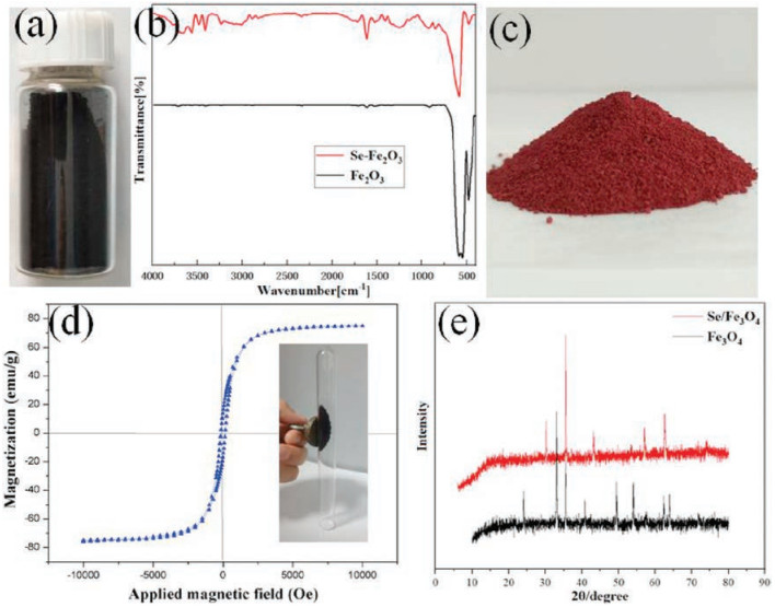 | Fig. 1. Photographs and characterizations of the materials: (a) Photograph of the selenized Fe2O3; (b) IR spectra of the selenized and unselenized Fe2O3; (c) Photograph of the starting Fe2O3; (d) Magnetometer hysteresis loops of the selenized Fe2O3; (e) XRD patterns of the selenized material (Se/Fe3O4) and Fe3O4. | |