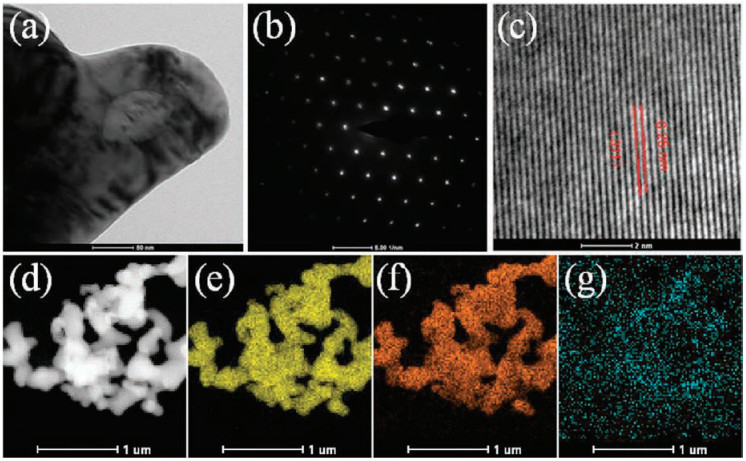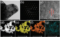 | Fig. 2. Composition analysis of Se/Fe3O4: (a) TEM image; (b) Electron diffraction pattern; (c) HR-TEM image; (d) HAADF-STEM image, (e-g) elemental mapping images of (e) Fe, (f) O and (g) Se. | |