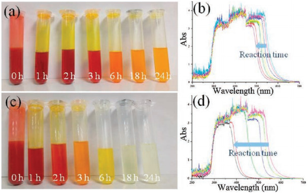 | Fig. 3. (a) Photographs and (b) UV–vis spectra of β-carotene degradation reactions with Fe3O4. (c) Photographs and (d) UV–vis spectra of or Se/Fe3O4. | |