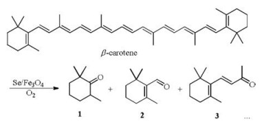 Moreover, the gas chromatography-mass spectrometry (GC-MS) analysis demonstrated that in the oxidation reaction catalyzed by Se/Fe3O4, β-carotene decomposed into a variety of fragments, such as the 2, 2, 6-trimethylcyclohexan-1-one (1), 2, 6, 6-trimethylcyclohex-1-ene-1-carbaldehyde (2), (E)-4-(2, 6, 6-trimethylcyclohex-1-en-1-yl)but-3-en-2-one (3), etc. (Scheme 1, for detailed mass spectra of the products, please see the Supporting information). Compound 3 was the major product of the reaction and it could be isolated in 62% yield. β-carotene was observed in the GC-MS spectra, showing that the chemical was completely converted. These results attested that the fade of β-carotene was caused by the complete C—C scission leading to small molecules other than the epoxidation or dihydrogelation reactions, which might also destroy the conjugation system of color rendering [38]. The strong catalytic activity of Se/Fe3O4 leading to the oxidative C—C scission might attribute to the synergistic effect of Se with Fe, which has been reported by our group previously [40]. As a magnetical mateiral, Se/Fe3O4 was easily recovered and could be reused for at least five times in β-carotene degradation.