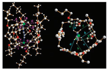 | Fig. 3. Single-crystal structure of 1E⊂BuP5A. Pink dashes (A-I) represent C-H…Cl, bright blue dashes (a-d) represent C-H…π and green dashes (e-h) represent C-H…O interactions between 1E and BuP5A. | |