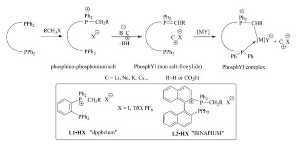 | Scheme 1. Phosphine-phosphonium salts and ylides there of (PhosphYls) as LX-chelating ligands of late transition metals M (e.g., Ru, Rh, Pd). | |