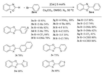 With the view to accessing functional hetero-aromatic systems without resorting to an ortho-directing group, the reaction of the benzoxazole substrates 1 with various aryl halides 2 was considered [7]. The target 2-aryl-benzoxazole products 3 indeed exhibit versatile properties [18], going from antibacterial [19], cholesterol ester transfer protein inhibition [20], adenosine receptor antagonism [21], amyloidogenesis inhibition [22], and thioflavine-like binding affinity to β-amyloid plaques [23], to fluorescence in the solid state [24].