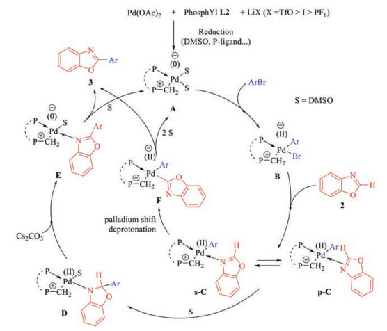 | Scheme 3. Putative mechanism for PhosphYl-Pd-catalysed 2-arylation of benzoxazole: alternative to the depicted Pd(0)/Pd(Ⅱ) cycle, a Pd(Ⅱ)/Pd(Ⅳ) cycle might also be envisaged. | |