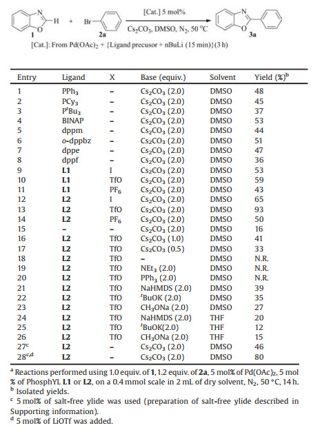 Benzoxazole 1 and bromobenzene 2a, or 4-bromoanisole 2b, were selected as the model reactants. From a preliminary screening under various conditions, the following conditions were adopted: DMSO as a solvent, Cs2CO3 as a base and Pd(OAc)2 as catalyst precursor at 50 ℃ for 14 h (Table 1). At the outset, commercially available monodentate phosphines, PPh3, PCy3, PtBu3, were first selected as standard reference ligands, giving 3a in 48%, 45% and 37% yields, respectively (entries 1-3). Bidentate phosphines BINAP, dppm, o-dppbz, dppe and dppf also gave medium yields of 53%, 44%, 51%, 47% and 36%, respectively (entries 4-8). Under the same conditions, using the methylphosphonium salt L1· HX(X=I, TfO, PF6) of o-dppbz as pro-ligand (nonsalt-free PhosphYls L1/HX or L2/HX were separately prepared by deprotonation of L1·HX or L2·HX with nBuLi in DMSO solution during 15 min at room temperature), the coupling product 3a was isolated in 53%, 59% and 43% yields, respectively (entries 9-11). These results are similar to those obtained by bidentate phosphines, and then it was decided to change the o-dppbz backbone to the BINAP backbone. The use of the BINAPIUM ylide generated from L2·HI gave 3a in an improved yield of 65% (entry 12). The same ylide L2 generated from L2·HOTf gave 3a in a much higher yield of 93%, revealing a dramatic counterion effect (entry 13). This was confirmed by the result of L2·HPF6, giving 3a in a twice lower yield of 50% (entry 14), thus showing a correlation of the yield with the association effect between the anion and the Pd and/or P+ centers [27].