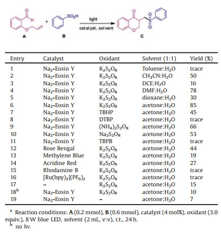 Visible light as a clean energy source has been widely used in organic synthesis [19-25]. At present, various reactions such as C—C [26-28], C—O [29-31], C—N [32-36] bond activation reactions and others [37-41] have been successfully conducted in the presence of visible light. Among these photo-induced reactions, sulfonylation reaction continues to thrive [42]. At present, arylsulfinic acids or salts [43-48], sulfonyl chlorides [49, 50], sulfonyl hydrazides [51, 52] and sulfur dioxide [53, 54] have all been used as sulfonyl sources. In spite of the significant advances, the exploration of photo-induced methodology to some complicated sulfone-containing skeletons still remains highly desirable. In line with our interest in heterocyclic compound synthesis and visible-light induced reactions [55-60], herein, we reported a visible-light induced method for the synthesis of sulfonated chroman-4-ones derivatives.