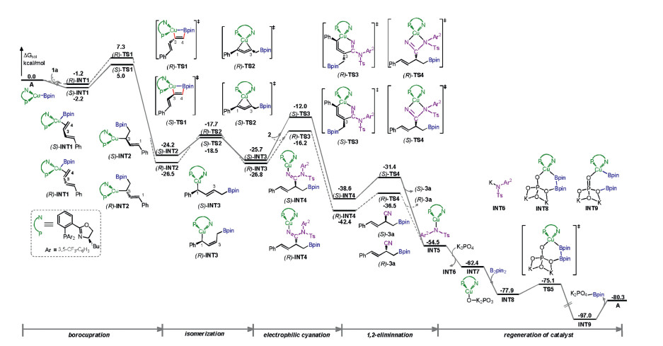 The 1-phenyl-1,3-butadiene 1a was selected as the model substrate in the current calculations. The calculated energy profile of the 4,3-borocyanation of 1a is given in Fig. 1. The computations show that the reaction is initiated by the coordination of the C3-C4 double bond of 1a to the Cu center of active catalyst A, leading to the formation of intermediates (S)-INT1 and (R)-INT1, which was calculated to be exergonic by 2.2 and 1.2 kcal/mol, respectively. Then, the ensuing 4,3-borocupration was found to take place via transition states (S)-TS1 and (R)-TS1, with the energy barriers of 7.2 and 9.5 kcal/mol relative to (S)-INT1. The borocupration was calculated to be highly exergonic, as evidenced by the resulted allyl copper intermediates (S)-INT2 and (R)-INT2 being much more stable than (S)-INT1 by 22.0 and 24.3 kcal/mol, respectively.