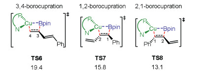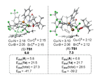 The next step of the reaction is the 1,2-elimiantion of the copper tosylamide INT5, which was calculated to proceed via transition states (S)-TS3 and (R)-TS3, leading to the 4,3-borocyanation products (S)-3a and (R)-3a, respectively.