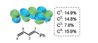 Previous studies have demonstrated that the nature of the borocupration is the nucleophilic attack of the boryl group on the alkenes, and the orbital percentage contributions of the carbon atoms in the lowest unoccupied molecular orbital (LUMO) of alkene play an important role in determining the regioselectivity [6a, b]. The LUMO analysis of 1a indeed correlates quite well with this finding, showing that the contribution of the C4 atom is among the highest (Fig. 4). This is due to the presence of the π-electron withdrawing phenyl group at the C1 atom makes the C4 atom being more electrophilic than the other carbon atoms, which thus results in the addition of the Bpin group to the C4 atom being favorable. Further to this, the steric repulsion around the forming C-B bond in the 4,3-borocupration transition state should be smaller than that in the other transition states (see Supporting information for the optimized geometries), which also contributes to the experimentally observed exclusive 4,3-regioselectivity.