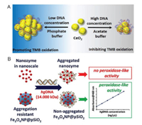 | Fig. 3. Schematic illustration of DNA-induced aggregation of (A) CeO2 nanozyme in different buffer systems and the resultant enhancement and inhibition performance on CeO2 activity. Copied with permission [85]. Copyright 2020, Wiley. (B) Fe3O4NP@pSiO2 nanozyme and its activity inhibition for colorimetric hgDNA sensing. Copied with permission [86]. Copyright 2019, Elsevier B.V. | |