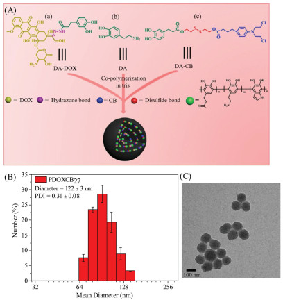 | Fig. 1. (A) One-pot aqueous precipitation copolymerization for the preparation of dual drugs-conjugated PDOXCBs nanoparticles. (B) DLS and (C)TEM data for PDOXCB27. | |