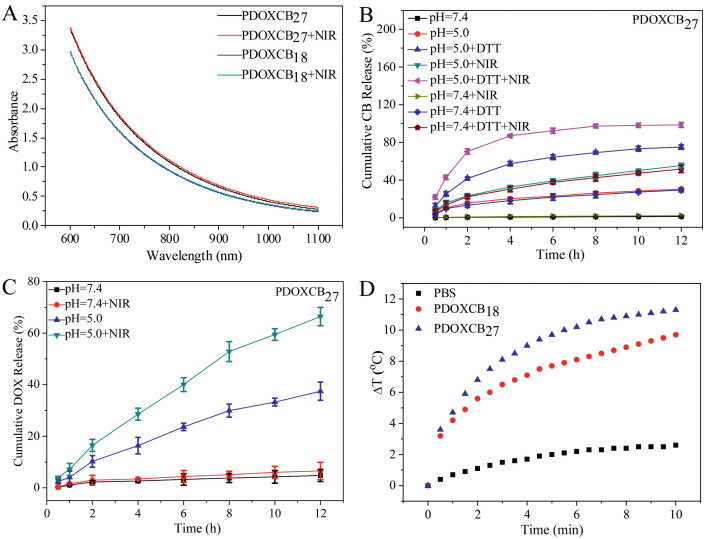 | Fig. 2. (A) The Vis-NIR spectra ofthe PDOXCBs solution with or without NIR irradiation (808 nm, 1 W/cm2, 10 min). (B) The temperature-elevation magnitude of the PDOXCBs solution (PDOXCB18: 280 mg/mL; PDOXCB27: 300 mg/mL) dependent on the irradiation time upon the NIR irradiation. The stimuli-sensitive dual drug-releases profiles (C, DOX; D, CB) of PDOXCB27 in PBS at 37 ℃ (n = 6). | |