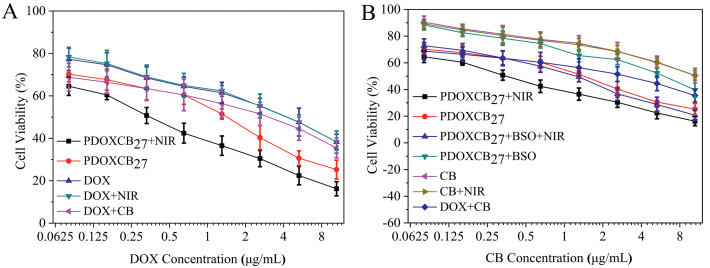 | Fig. 3. The cytotoxicities of PDOXCB27 dependent on DOX (A) or CB (B) when incubated with MCF-7 with/without NIR irradiation or addition of BSO in contrast to free DOX, CB and free DOX + CB (n = 6). | |
