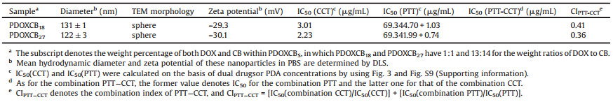 In summary, the dual drugs-conjugated PDOXCBs nanoparticles were facilely prepared by utilizing one-pot aqueous precipitation copolymerization of two dopamine prodrugs under mild conditions, which integrated the intrinsic NIR-mediated photothermia of PDA backbone with the polyprodrug-induced cocktail chemotherapy (i.e., simultaneous release of DOX and CB) into one nanoparticle. PDOXCBs present a mild photothermal conversion property and triple stimuli-triggered (i.e., pH 5.0, 10 mmol/L DTT and NIR) drug-release profiles. When the MCF-7 cells were incubated with PDOXCB27 plus a mild NIR irradiation (808 nm, 1 W/cm2, 10 min), the combination PTT-CCT treatment gave a highly lowered IC50 of 2.23 mg/mL than single PTT or CCT and a combination index of 0.36, exhibiting a superior synergistic effect between PTT and CCT in vitro. Therefore, this work establishes a versatile platform for one-pot preparation of the NIR-responsive polyprodrug-based nanoparticles with potential application in the combination PTT-CCT.