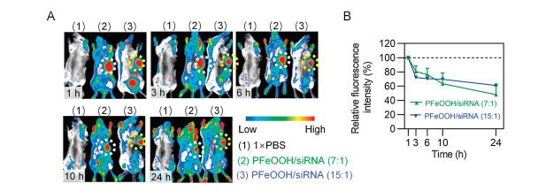| Fig. 3. In vivo fluorescence imaging and quantitative analysis of the 4T1 xenograft tumor-bearing BABL/c mice following i.t. injection of PBS, PFeOOH/siRNA (7:1) and PFeOOH/siRNA (15:1). (A) Whole-body imaging of representative mice acquired at the indicated time points post injection. (B) Relative fluorescence intensities in the tumor regions determined by normalizing to the initial fluorescence intensity of each group (n = 3). Data were shown as the mean ± SEM. | |