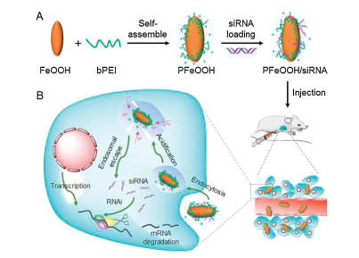 | Scheme 1. Schematic illustration of siRNA delivery mediated by PFeOOH NPs. (A) Formation of PFeOOH NPs and PFeOOH/siRNA complexes. (B) Cartoon illustration of the PFeOOH/siRNA complexes for targeted siRNA delivery and RNA interference (RNAi) pathway. | |