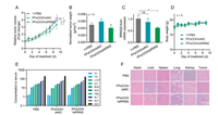 | Fig. 4. Antitumor effect of siRRM2-loaded PFeOOH NPs in 4T1 tumor-bearing BABL/c mice. (A) Relative fold changes of tumor volumes normalized to the starting point. (B) Normalized average tumor weights at the end observation time. The tumor weights of the animals were normalized to the corresponding tumor volumes of the animals recoded at the starting point, which could erase the influence of differences of tumor sizes on the final treatment efficacy. (C) Expression of RRM2 mRNA in tumor tissues. (D) Changes in body weight of the animals. (E) Serum biochemistry parameters measured in mouse specimens collected at the end time point. (F) Histological assessments of major organs and tumor tissues using H & E staining. Data are presented as mean ± SEM. *P < 0.05; **P < 0.01; ns, no significant difference was observed. n = 5. | |