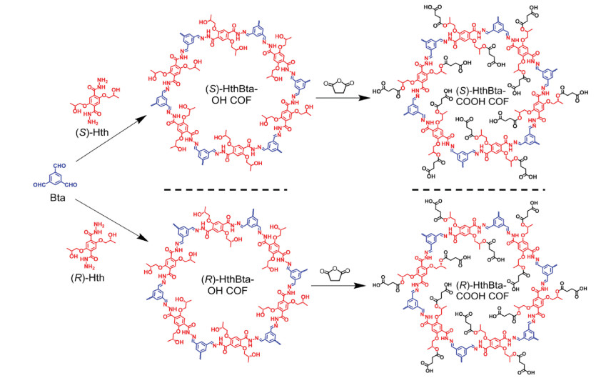 | Scheme 1. Synthesis of chiral (S)- and (R)-HthBta-OH COFs as well as the corresponding (S)- and (R)-HthBta-COOH COFs by post-synthetic modification. | |