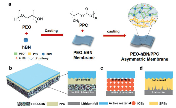| Fig. 1. (a) Schematic diagram of PBP composite electrolyte by the solution-casting method. (b) Schematic diagram of PBP composite electrolyte with asymmetric double layered structure, in which the PPC layer can provide intimate contact with cathode while the hBN modified PEO layer with high mechanical stress suppresses Li dendrite growth. (c, d) The comparisons with the electrolytes of single layer. | |