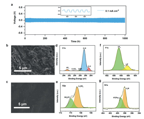 | Fig. 4. (a) Voltage profiles of the Li|PBP|Li symmetric battery. The inset is the magnified curve. Surface SEM images of Li-metal in (b) PEO electrolyte and (c) PBP electrolyte on PEO-hBN side. XPS results of Li-metal surface: (d) C 1s, (e) S 2p, (f) F 1s, (g) N 1s. | |