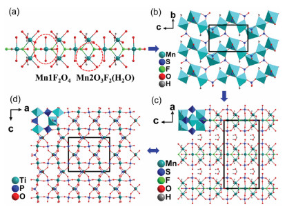 From the viewpoint of structural evolution, I can be regarded as a derivative of KTP, in which the TiO6 octahedra and PO4 tetrahedra are substituted by Mn1O4F2 and Mn2F2O3(H2O) octahedra and SO4 tetrahedra, respectively (Figs. 1c and d). Different from the three-dimensional framework composed of PO4 and TiO6 in KTP, I exhibits a layered structure with [Mn3(SO4)3F2(H2O)2]∞ layers. Meanwhile, the connection of octahedra is different. In the structure of KTP, the distorted TiO6 octahedra share their corners through axial oxygen atoms to form infinite chains. In comparison, each Mn1O4F2 octahedron is linked to four Mn2O3F2(H2O) octahedra via corner-sharing and two neighboring Mn2O3F2(H2O) octahedra are connected via edge-sharing in the infinite chains of [Mn3O10F2(H2O)2] (Fig. S4 in Supporting information).