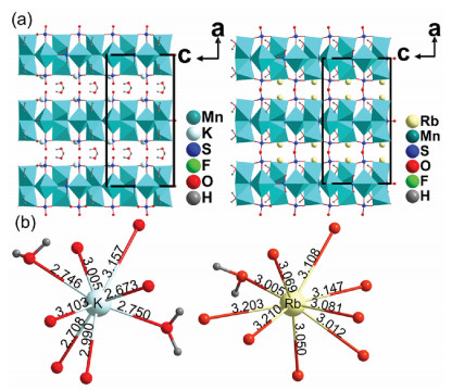 Despite I and Π have different molecular formula, they crystallize in the same space group and have similar layered structures composed of Mn1O4F2 and Mn2F2O3(H2O) octahedra and SO4 tetrahedra. As shown in Fig. 2a, H2O molecular and K+ cations occupy the interlayer spacing of I, whereas only Rb+ cations reside in the interlayer spacing of Π. This structural difference is responsible to the different formula. As shown in Fig. 2b, each K atom is coordinated to six oxygen atoms and two water molecular; each Rb atom is coordinated to eight oxygen atoms and only one water molecular. Clearly, the additional water molecular coordinated to the K atoms can provide a larger steric hindrance than oxygen atom, thereby stopping the crystal structure of I from collapse, since the K-O distances are evidently shorter than that of Rb-O (Fig. 2b).