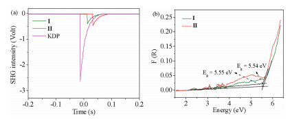| Fig. 4. (a) Comparison on SHG signals for I, Π and KDP. (b) Diffuse reflectance absorption cure of I and Π. | |