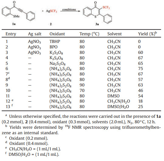Initially, tert-butyl hydroperoxide (TBHP) or benzoyl peroxide (BPO) was chosen as the oxidant, and the reaction of 1-(2-(methylthio)phenyl)-3-phenylprop-2-yn-1-one (1a) with AgSCF3 (2) was conducted in the presence of AgNO3 in CH3CN. But no desired 3-CF3S substituted thioflavone 3a was detected (Table 1, entries 1 and 2). When K2S2O8 was chosen as an oxidant, 3a was formed in 60% yield in the presence of AgNO3 (Table 1, entry 3). However, the yield of 3a was slightly increased in the absence of AgNO3, which indicated that extra transition metal catalyst was not necessary for this reaction (Table 1, entry 4).