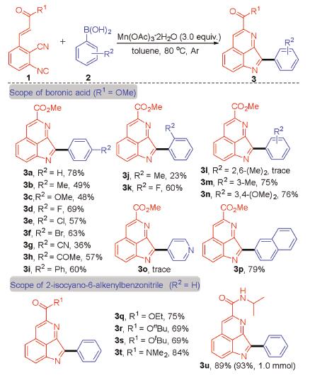 In summary, we have developed a radical cascade reaction of 2-isocyano-6-alkenyl(alkynyl)benzonitriles with arylboronic acid in the presence of Mn(III). This reaction provides a novel strategy for the construction of pyrroloisoquinoline derivatives in one step via the formation of two C—C bonds and one C—N bond, which has high step and atomic economy.