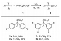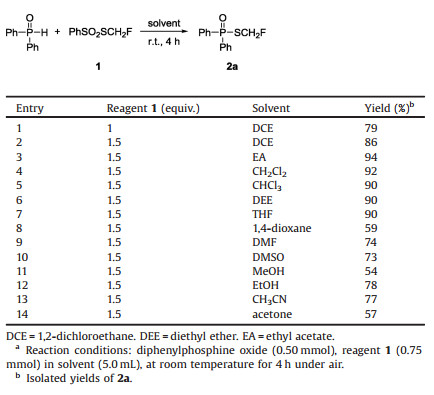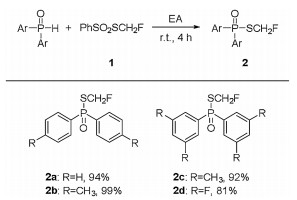 We firstly chose commercially available diphenylphosphine oxide and monofluoromethylthiolating reagent (PhSO2SCH2F) 1, which was developed by Shen and Lu [44], as the model substrates to optimize the reaction conditions (Table 1). The initial reaction condition was set at room temperature for 4 h. To our delight, the reaction occurred smoothly in 1, 2-dichloroethane without additives and afforded the corresponding monofluoromethylthiolated product 2a in 79% isolated yield (Table 1, entry 1). When the amount of PhSO2CH2F was increased to 1.5 equiv., the reaction gave full conversion of diphenylphosphine oxide and the yield of product was increased to 86% (Table 1, entry 2). Further solvent screening showed that the reaction could work in common organic solvents. The reaction in ethylacetate afforded the desired product in highest 94% yield (Table 1, entry 3). Other solvents such as dichloromethane, chloroform, diethyl ether, tetrahydrofuran were also very effective for this reaction, while more polar solvents such as 1, 4-dioxane, DMF, DMSO, CH3OH, C2H5OH, CH3CN and acetone gave the product in lower yield (Table 1, entries 4–14). With the optimal conditions in hand, we expanded the scope of substrates. As shown in Scheme 1, both electron-rich and electron-deficient diphenylphosphine oxides reacted smoothly to afford the corresponding products in good yields (2a-2d).