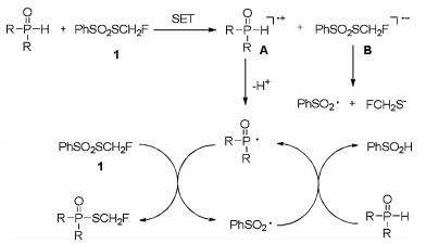 Based on these experiments and the related literatures [24, 32, 45-47], we proposed a tentative mechanism for the reaction of PV-H compounds with reagent 1 (PhSO2SCH2F) (Scheme 3). In the reaction, PV-H compound donated a single electron to PhSO2SCH2F to form the radical cation A and radical anion B. Then the resulting radical cation A loses proton to generate phosphoryl radical, meanwhile, anion B decomposes to PhSO2 radical and monofluoromethylthiol anion. The phosphoryl radical reacts with PhSO2SCH2F to give the corresponding S-monofluoromethyl phosphorothioates, together with the formation of PhSO2 radical [44]. The generated PhSO2 radical might abstract the hydrogen of PV-H compound to produce the phosphoryl radical and PhSO2H to finish the radical chain cycle. More details about the mechanism of the reaction are ongoing.