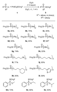 | Scheme 2. Scope of monofluoromethylthiolation of H-phosphonate. H-Phosphonate (0.5 mmol), 1 (0.75 mmol) and Et3N (0.5 mmol) in diethyl ether (5.0 mL), at room temperature for 1-4 h, under air. All yields given are isolated yields. | |