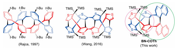 Being composed of four thiophene rings fused to cyclooctatetraene (COT), COTh possesses special saddle-shaped molecular structure, which is usually employed as an important building block in organic functional materials. As early as in 1974 [1], the first isomer of COTh was reported by Kauffmann. Over the past four decades, many work about the derivatives based on COTh units in both organic synthesis and applications have been carried out [2]. Among them, all thiophene-based double helix has a novel helical structure, in which two single helices are intertwined with each other via the C—C single bonds [3-6]. Such DNA-like double helical motifs connected by covalent bonds show extraordinary aesthetically pleasing structures, which are very rare to be presented in the literature. In our previous work, we have focused on synthesis and property research of COThs and their derivatives, including double helicenes [4-7]. Our recent double helices constructed with COTh units [8] (Fig. 1) show the same molecular frameworks of double helices constructed by cyclooctatetraphene (COPh) units, reported by Rajca [9] (Fig. 1) and Wong [10]. These derivatives have not only novel helical structures but also potential applications in supramolecular polymer [11, 12], molecular muscle [13, 14] and self-assembly [15], and therefore have attracted continuous attention.